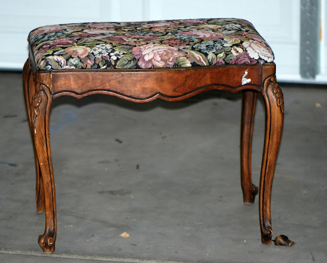 One of my current home projects is organizing and adding some style to my closet. I had found an old stool at a local thrift store and thought it would perfect as a small bench to use in my closet as a place to sit when putting on my shoes. Its compact size makes it easy to store when not in use. But it needed to be repaired and updated.