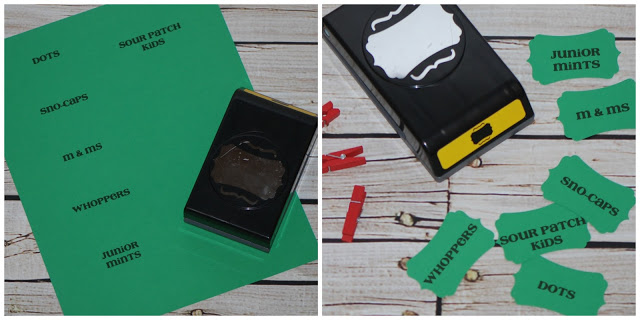 Create food labels – Type and print the names of the sweets. Print on coordinating cardstock. Use a paper punch to cut out. Attach to bowls with mini clothespins.