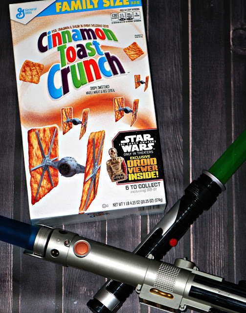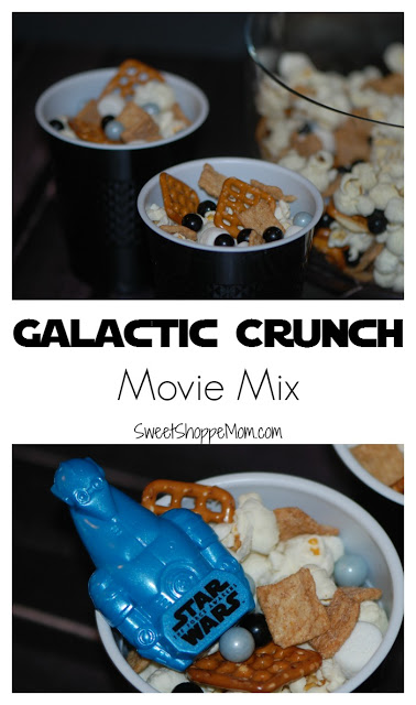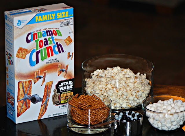 Anytime I’m hosting a bunch of boys, I need to be prepared with lots of snacks.  It’s going to be a full day marathon so we need lots of food – boys sure can eat! I picked up the ingredients to make movie snack mix including Star Wars™ Cinnamon Toast Crunch™ cereal. The box comes with a Star Wars: The Force Awakens exclusive Droid Viewer which my son thought was super awesome – our box came with the Pz-4co Droid. There are 6 Droid viewers to collect in specially marked General Mills Cereals. Each viewer has an image from the upcoming movie.