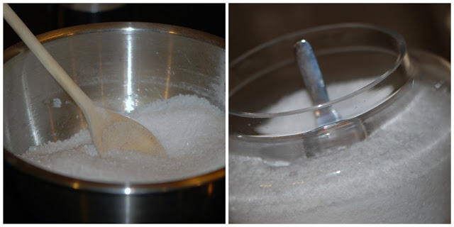 Simply mix both the salts and baking soda together. Add a few drops of essential oils – feel free to mix several scents to create your own. The salts can be tinted with a few drops of essential oils. Store in a glass jar. Add a few tablespoons of bath salts to a hot bath. Enjoy!