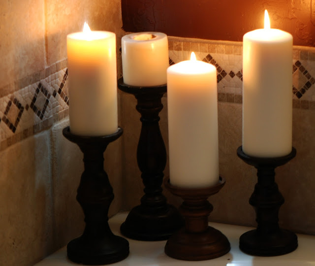 Tip #7 Add Soothing Elements Candles, scents, spa accents. Over the years, I’ve picked up candle handlers from thrift stores. Display several around the tub and light while enjoying a bubble bath.