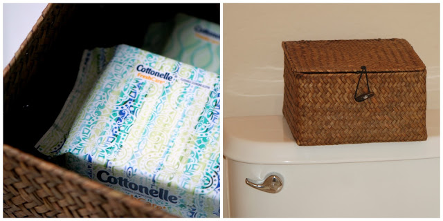 Baskets with lids are a great way to store things that you want easy access to, but out of site. I keep a basket on the back of my toilet – packages of Cottonelle® FreshCare* Flushable Cleansing Cloths fit in the basket perfectly and discretely.